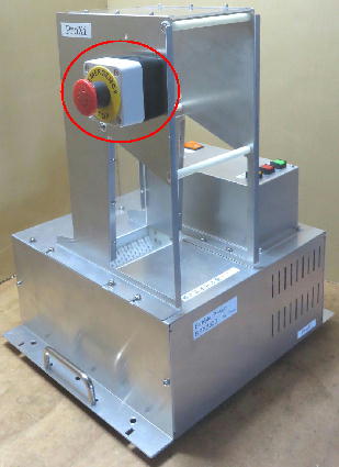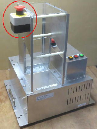 A1−13 基本的には操作ボックスの非常停止スイッチで充分と分析しています。 しかし、それを社内的に説得するのが困難の為、非常停止スイッチを別途設けたいというご要望を頂く事はあります。 その様なご要望にお応えする為に、オプションで非常停止スイッチを投入ガイド左側面に設けられる様にしましたので必要時はご依頼下さい。 押しボタンの方向はイメージ写真(配線無し)の様な天上向き、左側面向きの何れかを指定して下さい。